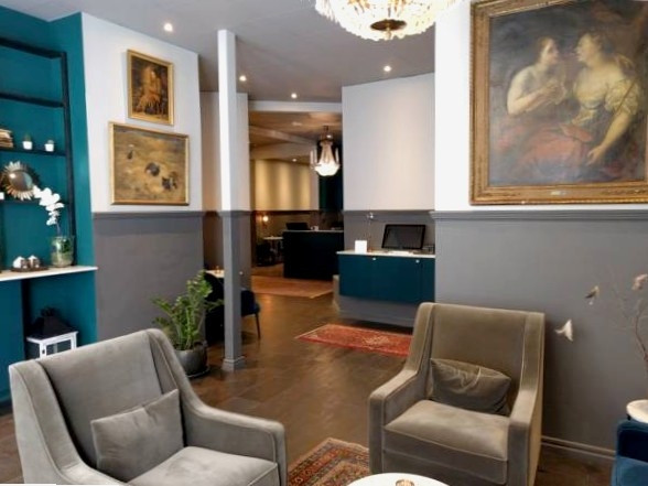 Hotellobbyn har en charmig atmosfär med kristallkronor och antika möbler. Här kan du koppla av i sofforna eller surfa gratis på datorerna med internet.