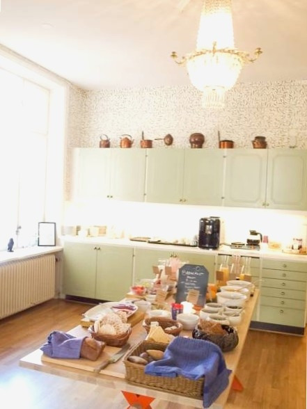 Skinnsoffor, en utsmyckad öppen spis och en traditionell kakelugn skapar en mysig atmosfär i den gemensamma loungen. Här finns även en mysig balkong som vetter mot innergården.