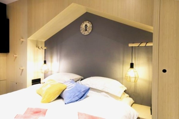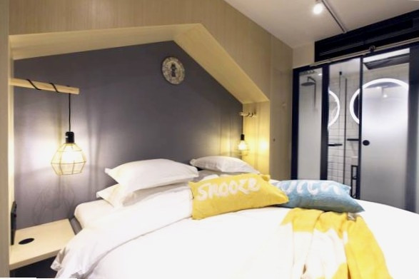 The industrial-modern rooms are fitted with a flat-screen TV, satellite channels and media sound system. The tiled bathroom features a rain shower. Rooms are without windows.